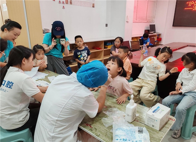 活动特邀景德镇市三和医疗口腔门诊的医生为孩子们带来“沉浸式”口腔健康守护服务。一对一免费口腔检查,细致排查龋齿、牙龈问题等常见口腔疾病,并为每位孩子建立简易口腔健康档案,同步向家长反馈检查结果与个性化护齿建议。随后,专家通过互动问答形式,围绕“正确刷牙方法”“少吃甜食的重要性”“定期口腔检查的必要性”等核心知识点展开科普,现场演示巴氏刷牙法,指导孩子亲手操作练习,让抽象的健康知识转化为可实践的日常习惯,有效提升青少年口腔健康意识。