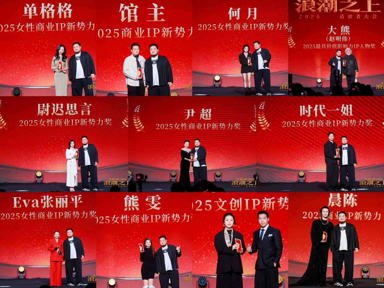 熊客集团创始人大熊荣获2025最具价值影响力IP人物奖、果小津荣获2025文创IP新势力、《睿趣人生》出品人尹超、不设限-75岁的刘明明、时代光芒传媒创始人尉迟思言、盛嘉华生物科技创始人单格格、青岛传媒学校校长何月、时代一姐、时髦定制局创始人张丽平、《小艾资本论》主理人熊雯荣获2025女性商业IP新势力奖,不鸣文化创始人馆主、無界复合空间创始人晨陈荣获2025商业IP新势力。