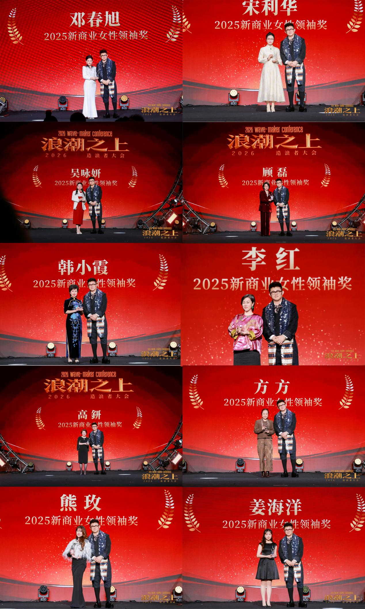 上海别出心裁服饰有限公司董事长邓春旭、上海汉启通信设备发展有限公司董事长宋利华、海南柔尚文化投资有限公司创始人吴咏妍、江苏佰利兹集团董事长薛福阳、香港摩太国际文化康旅董事长顾磊、珍妙科技创始人冯琏、锦晖医疗集团董事长郭丽梅、上海慕韩斋健康管理咨询有限公司总经理韩小霞、玉术李红创始人李红、向辉集团总裁田欣、梦玙集团董事长高鈃、上海珍域珠宝有限公司董事长方方、鸠申文化传播董事长熊玫、青岛商至信网络科技有限公司总经理姜海洋等代表荣膺“2025新商业女性领袖”称号。